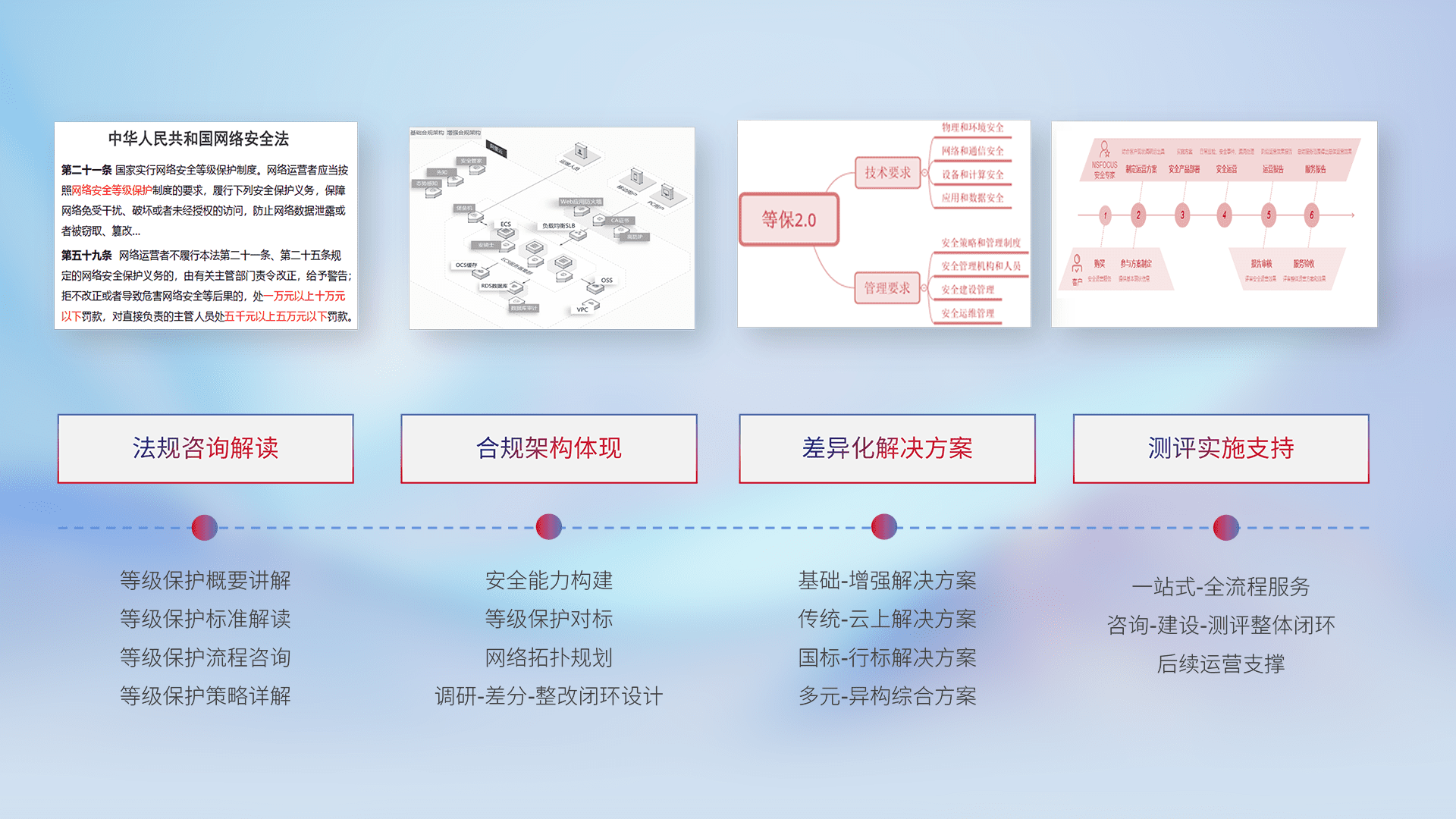 通过专业的法律咨询解读、、、、合规架构体现、、差异化解决方案、、、测试实施支持等服务,,,,为客户量身打造等保合规体系。。。。